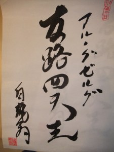 Peter on the picture is showing here the kosei no kamae as if he was receiving some kind of attack from his opponent. As though “kosei” means “attack” he is absorbing the blow with his protected forearm (aite to kumu kokoro gamae) and uses his legs to cushion it. Next he will spring forward and take uke‘s balance to counter-attack. Once the blow has been received, there is no power left in the weapon, the momentum is gone.