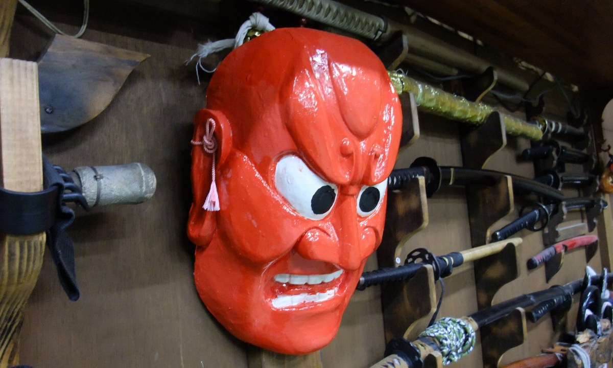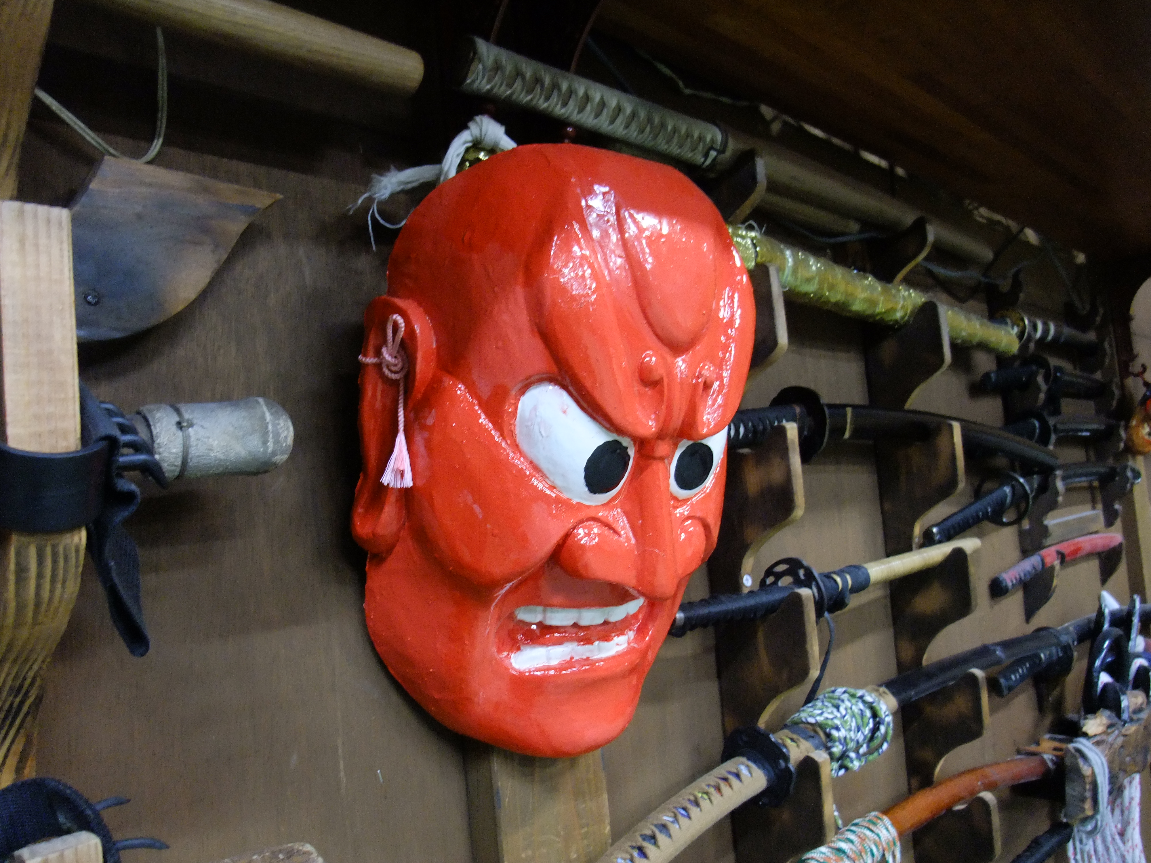 Since the big earthquake in March there is a new mask under the Shinden at the hombu dôjô. Sensei painted it in a bright orange color as this is the color for protection in Shintoism. The Torii (鳥居) at the entrance of the Shintô temples is often painted with this bright orange to indicate that the area is protected. Sensei explained Sunday during his class that he put it there to protect the dôjô. I like this mix of tradition and modernity always present in Japan.