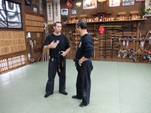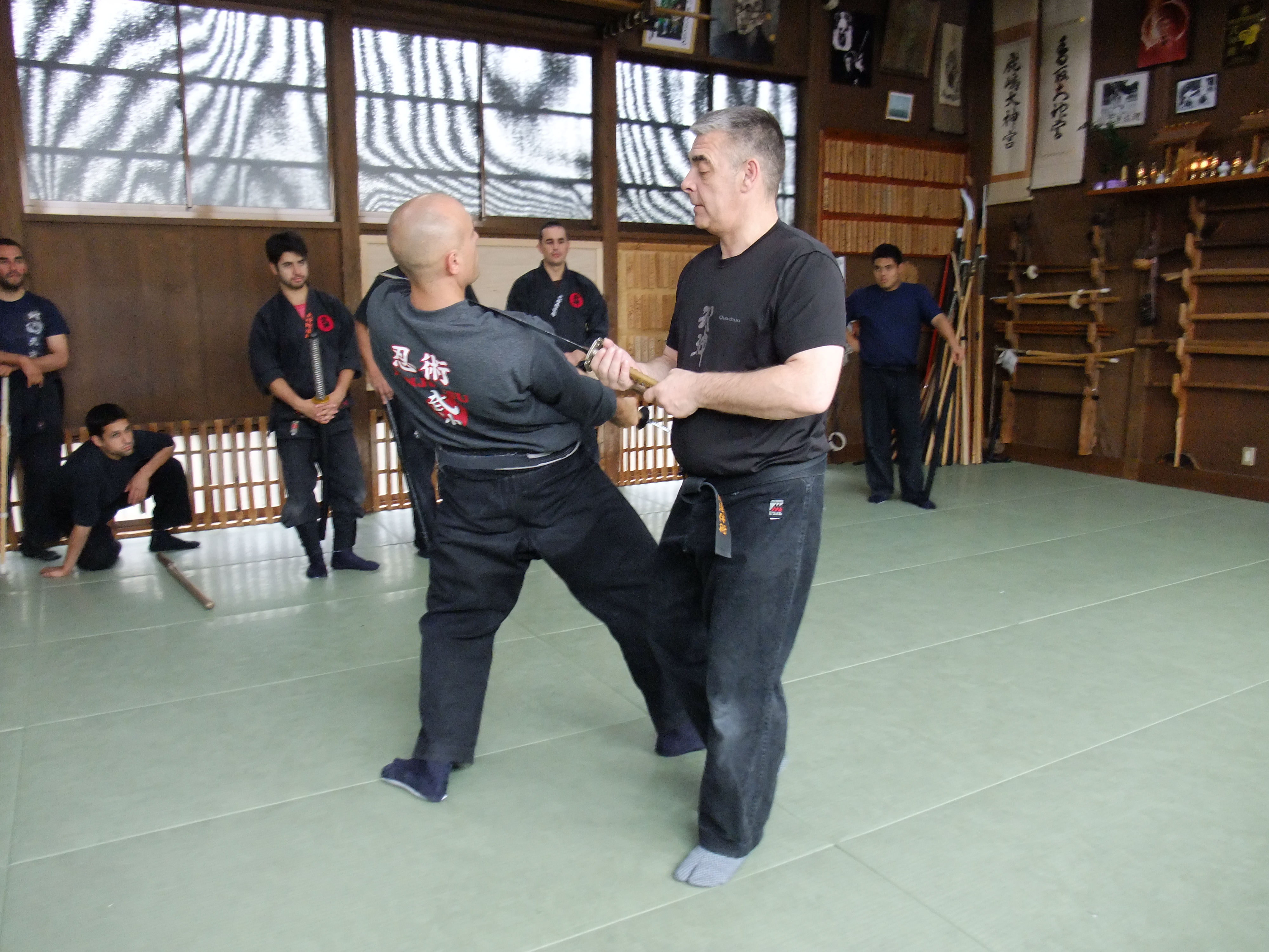 The first part of my class was dedicated to taijutsu and we reviewed the differences between kosshi (骨子), koppô (骨法) and ninpô (忍法) as well as the kamae of each level of the gyokko ryû: ten ryaku uchu gassho no kamae, fûten goshin gassho no kamae, hanno bonitsu no kamae, ending all in tenchi inyo no kamae. As these kamae are linked individually to each one of the three levels of the school, they give a better understanding of the school syllabus and progression. After a short break we reviewed the sword techniques demonstrated by Hatsumi sensei in his previous classes last week. They were mainly based on the variations of tsuki komi from the kukishin ryû and use the whole body (karada – 身体).