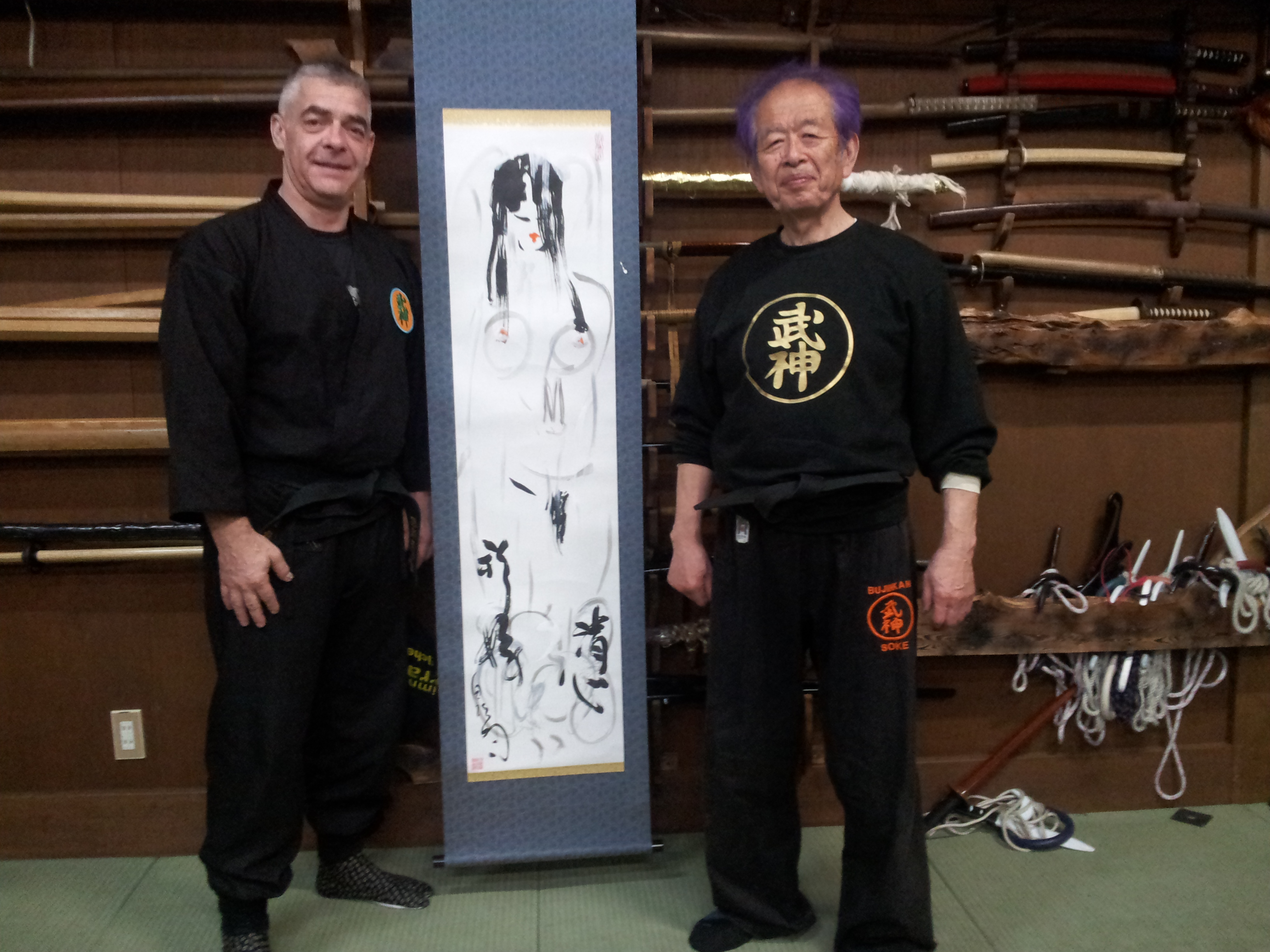 As often when I arrive in Japan for my first class, Hatsumi sensei asked to open the class and as I have recorded recently the Takagi Yôshin Ryû with my Indian Buyu, this is a Takagi like movement that came out. When you are asked to show it is always better to have nothing “ready” so that what you are doing reflects your own personal evolution since your last trip and not a fake movement repeated over and over to “look good” in front of the Sôke. Over the years I noticed that often the simplest movements are the best to trigger his creativity and in that way everyone in the class whatever rank he or she is wearing is able to get something out of it.