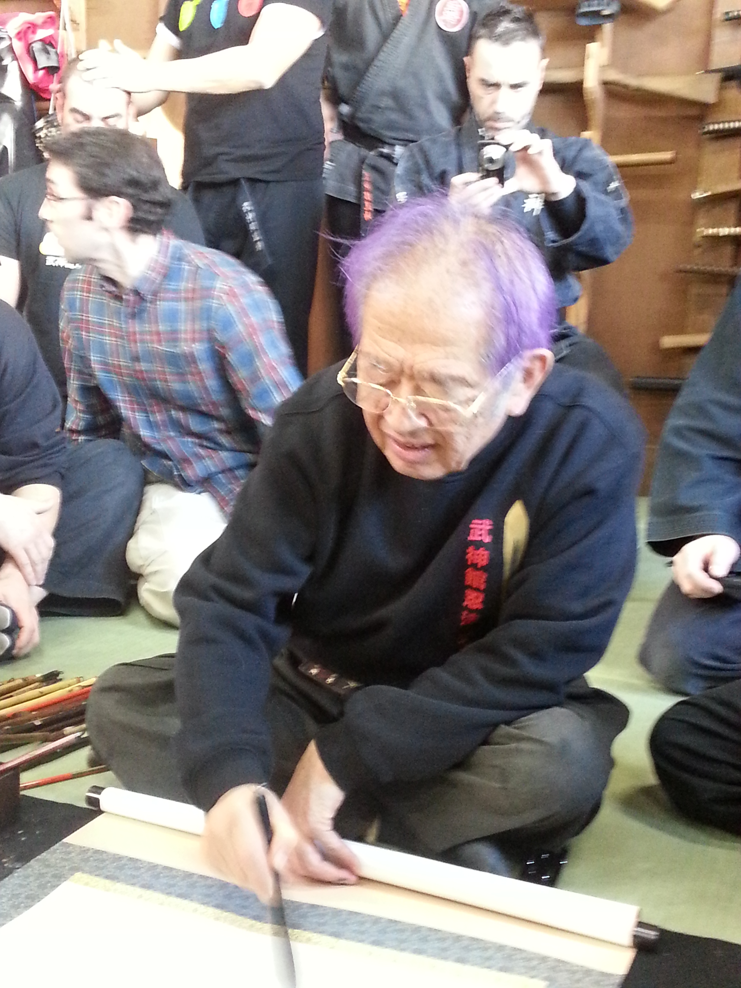 Receiving the punch he merely stepped forward and outside shielding the attack with the whole body. He said again that the theme of the year was Muto dori and that was not about defending yourself unarmed when facing a weapon. It is about moving fearless into the attack in a Mushin state of mind. The key to Muto Dori is to go toward the attacker with your guts.