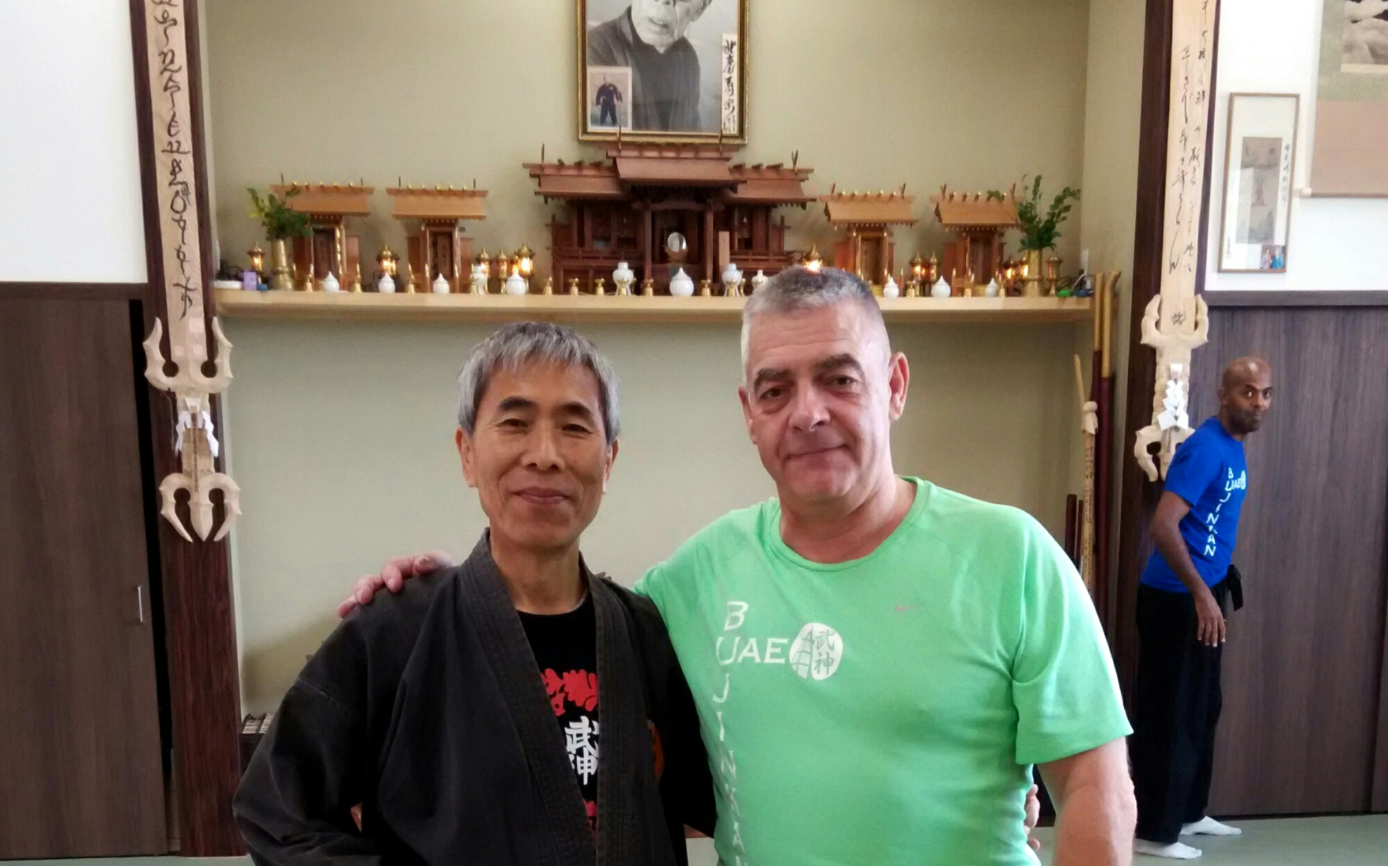 We did many movements based on this first technique: continuing to the left and hitting dō uchi, then reversing; using the back to unbalance uke and finishing with taijutsu, etc.).The movement was so natural that uke was trapped before he knew it.