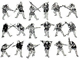 The last section of the Kukishin Bô is called “keiko sabaki gata” and consists in a series of 25 techniques. As always if you do not look at the kanji but only at the sounds, many meanings can be found in a good English dictionary.