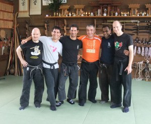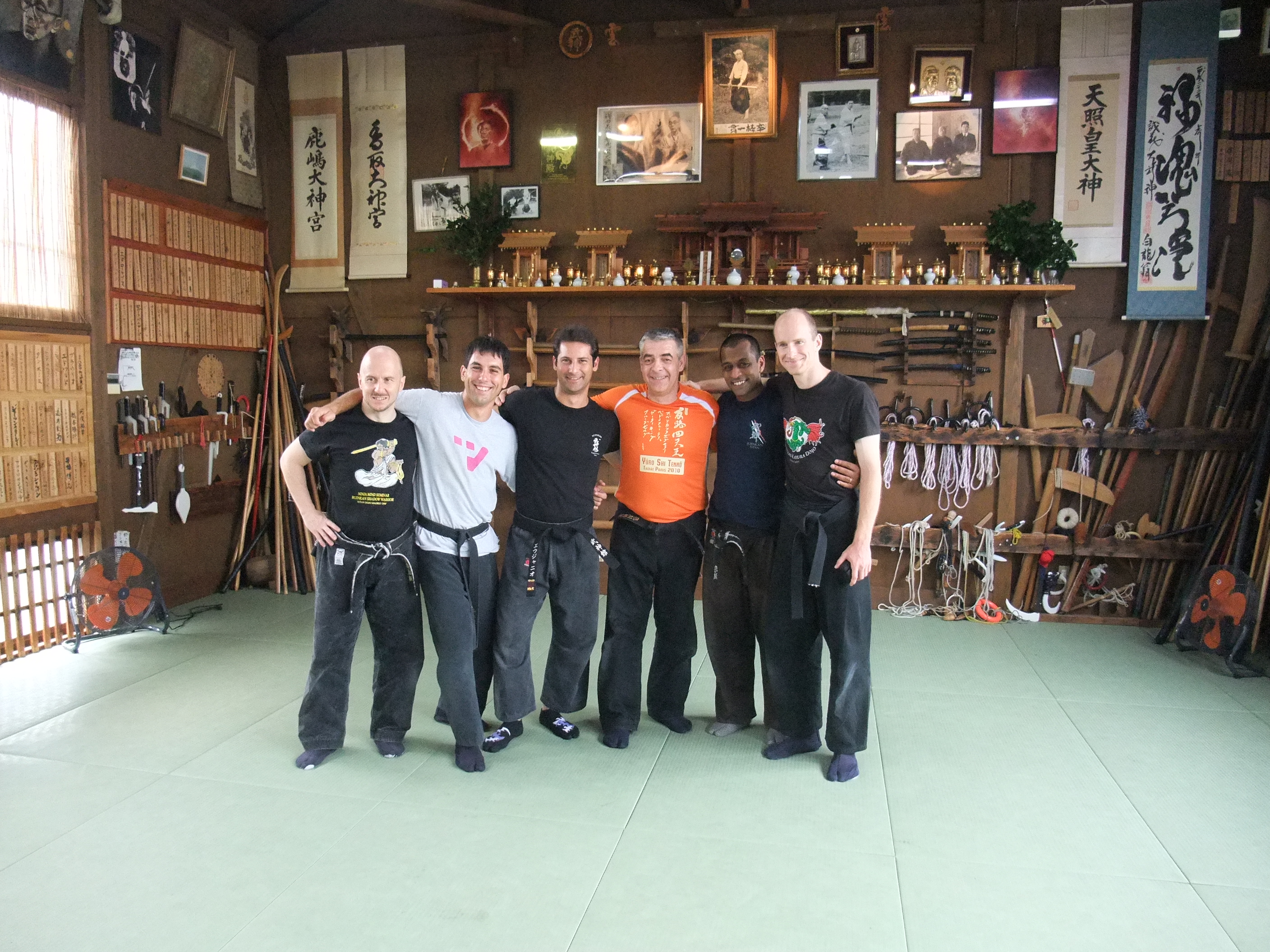 This trip also I appreciate the size of the “kuma group”: 6, roku. It goes well with the theme of the year rokkon shôjô as we are 6 souls (i.e. roku + kon = rokkon) living happily (shôjô). I must say that Shiva, Arjun, and Zam have become real buyu and have succeeded in blending within the bujinkan community. The other day sensei was telling us over lunch that he was not the “king” of the bujinkan and that NO ONE was in charge of a country. The bujinkan is a gathering of individuals and does not need any national organization to run it supposedly under his name. He added that we have to consider him more like some kind of spiritual guide giving the direction and the interpretation of things, a little like the pope. Through him we are all connected. That was last year concept of en no kirinai, or do not sever the connection. Yesterday I gave a class right before the one by Nagato sensei and this connection was obvious to all of us attending the two classes. The technical points Nagato sensei and I developed were so linked that some students asked me after his class if we had planned it beforehand as it looked like part 1 and part 2 of the same corpus!