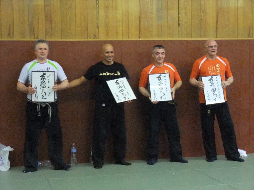 Last August when I brought Hatsumi sensei some pictures of the Taikai in Paris decided to change its name and to call it the “Yûro Shi Tennô Taikai“. When I asked him the reason for that he said this was a pun between “Europa” [yuropa] and the Japanese word “Yûro”. Yûro means something like the “path to bravery”.